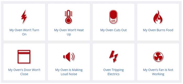 Here are the most common oven and cooker problems that we can help with, My oven won't turn on, oven won’t heat up, oven cuts out, oven burns food, oven's door won't close, oven is making loud noise, oven tripping electrics, fan is not working.